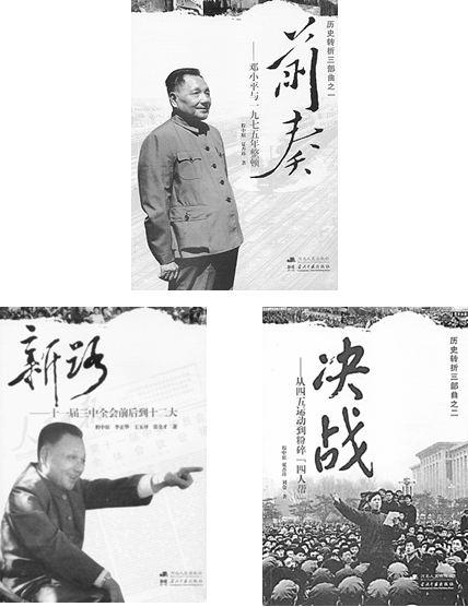 十一届三中全会实现的伟大历史转折,是科学总结新中国30年和国际共运100多年经验教训的集中体现,使马克思主义中国化的历史进程进入了新的阶段。程中原、夏杏珍、李正华、王玉祥、张金才、刘仓等人组成的历史转折研究课题组就这一主题进行了多年研究。日前由河北人民出版社和当代中国出版社推出的“历史转折三部曲”,是他们的重要阶段性成果,记述了从1975年邓小平主持整顿到中共十二大这一伟大转折时期的历史。它把伟大历史转折分为三个相互衔接的阶段,分别命名为《前奏》、《决战》、《新路》,体现了有分有合、分而不散的整体布局,展现了一幅伟大历史转折的政治图景,专家们认为,历史转折三部曲对这段历史中的重点、难点和热点问题作出了新颖、独特的论述,如:对1975年整顿为何中断的分析,对评《水浒》政治作用的评价,对邓小平为什么再次被打倒的分析,对华国锋、叶剑英和李先念、汪东兴在粉碎“四人帮”中历史作用的评价,对华国锋没有阻挠而是拖延邓小平复出事实的说明,等等,为历史转折研究提供了新的思路。
